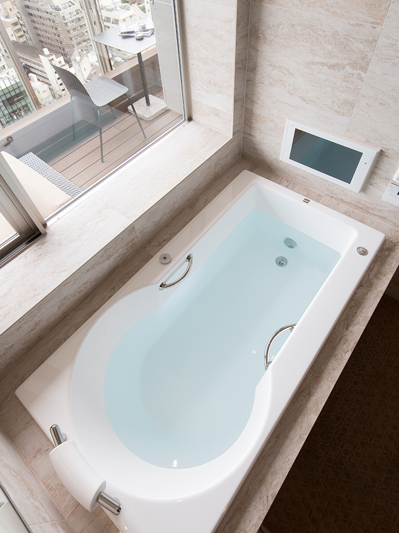 Details基本情報 サイズ 1800㎜× 2215㎜× 高さ2250㎜ 主な仕様 天井:化粧鋼板パネル 壁:494×994角タイル 床:タイル ドア:テンパードア(ステンレス枠) FIX:ステンレス枠 浴槽:アクリル浴槽 水栓:サーモスタット付きバス・シャワー埋込混合栓 テレビ:浴室用テレビ