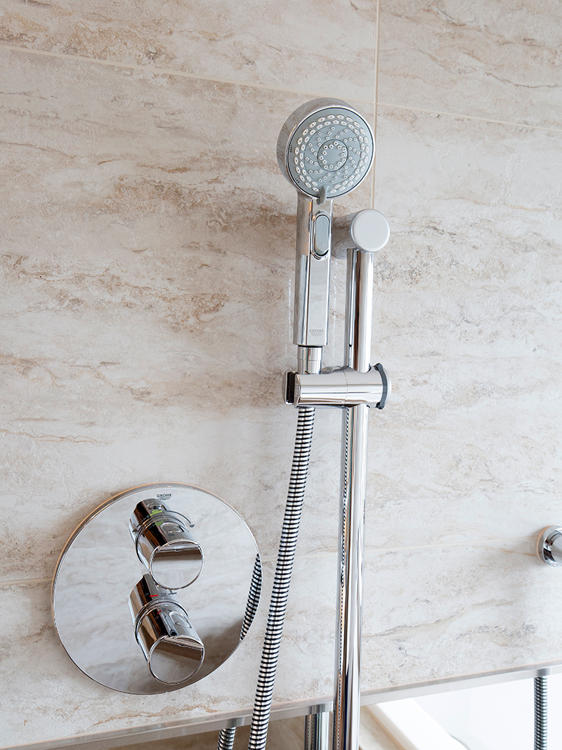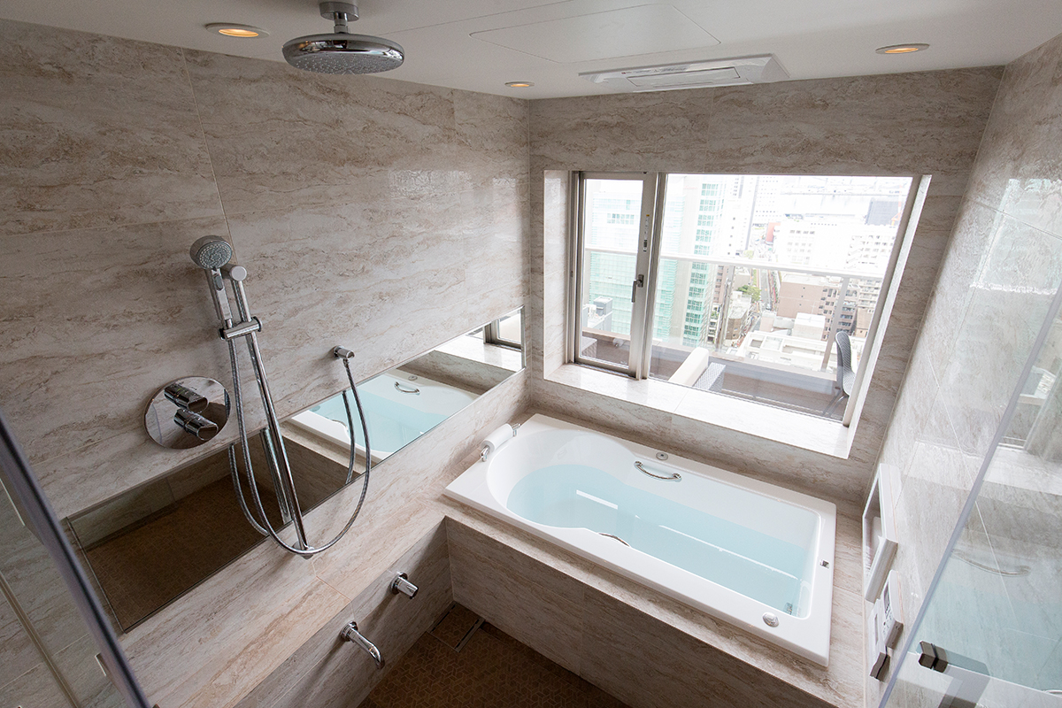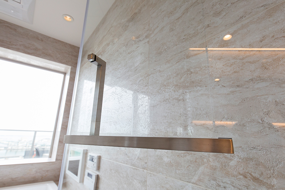 Outline概要 壁・床共にこだわって選んだタイルを使いたいとご希望でした。 ステンレスのドア枠はタイルで囲み洗面所の壁と一体化させました。 小笠原ならお客様のご要望やイメージをカタチにできます。浴槽や壁、床、バス空間内の細かいパーツまで、しっかりお打ち合わせをさせていただきカスタマイズします。数多くの企画施工を行ってきたからこそデザイン性にも自信があります。まずはご相談ください。