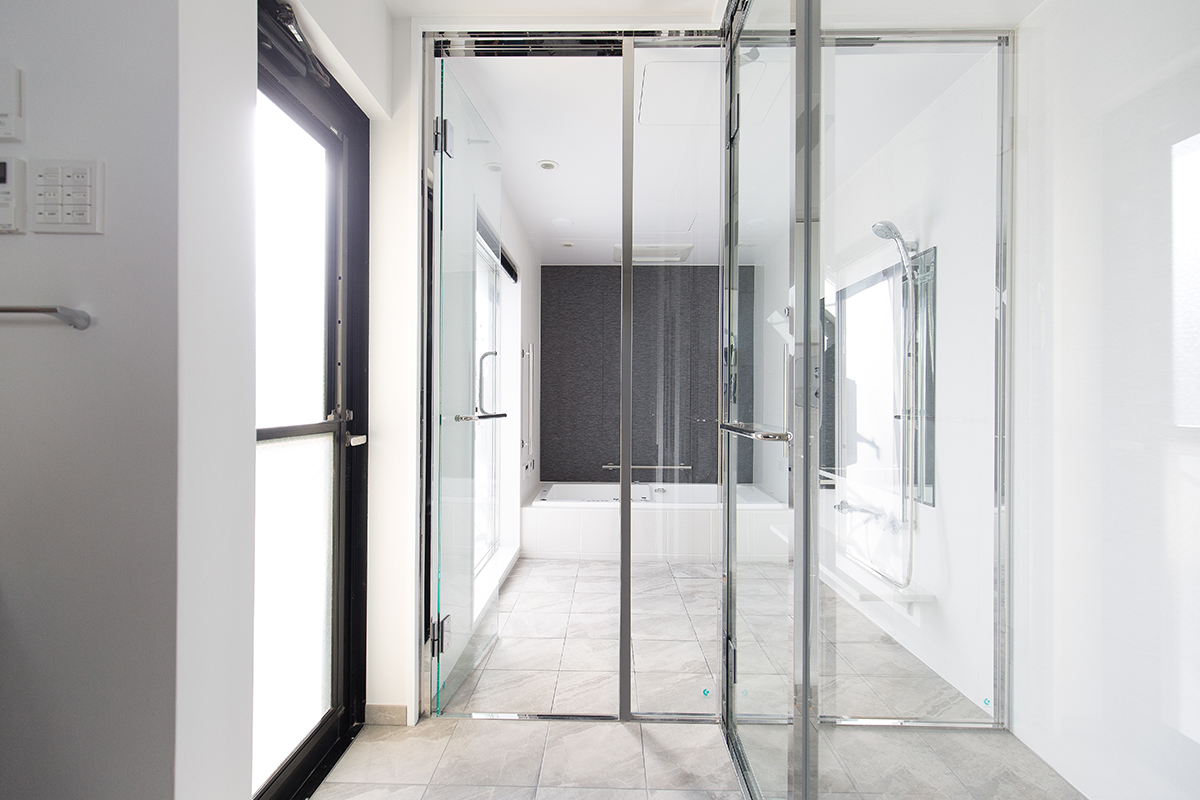 シャワールームを別に設け、アクセントパネルで高級感を演出しました。