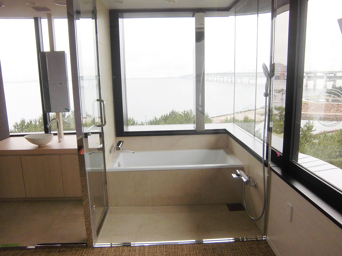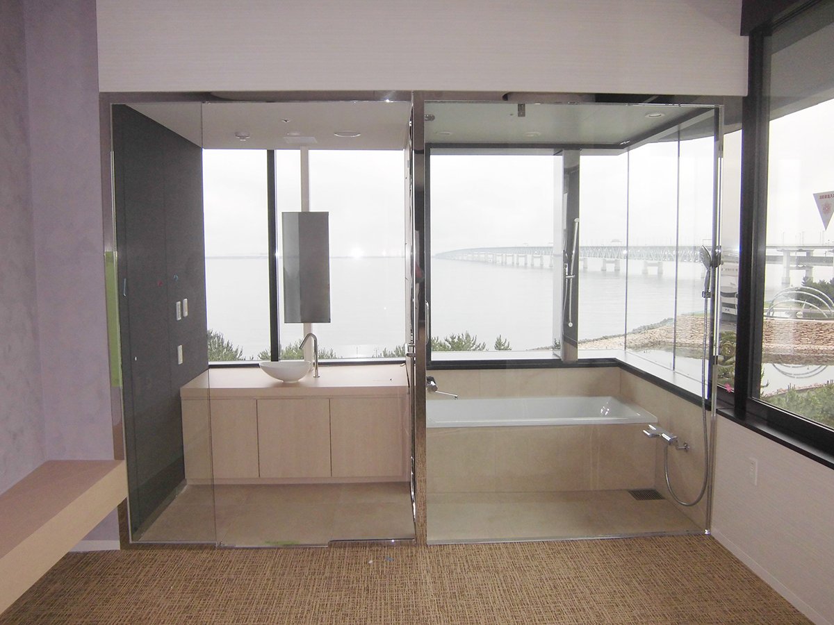 海と夜景を眺望できる浴室で、浴槽に入りながら海と夜景を眺望できます。ガラスを多く用いてクリアな浴室を実現しました。