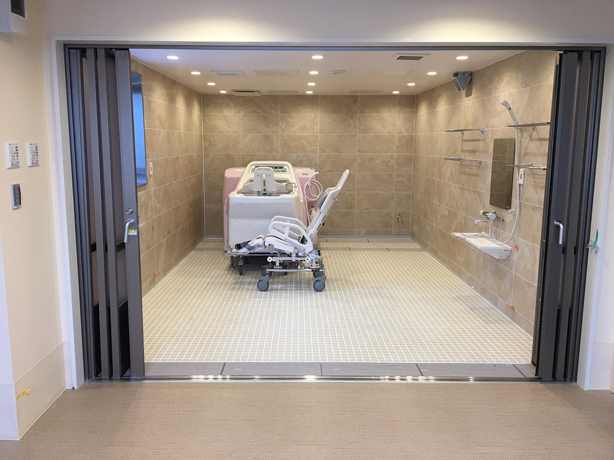 ユニットバス内にタイルを貼り、高級感を演出。浴室の入り口は、全面開口出来る仕様にし、脱衣場との繋がりを作ることで広々とした開放的な空間を作り出しました。