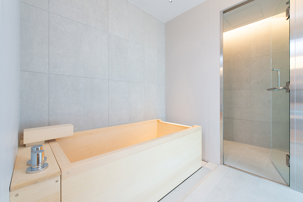 Details基本情報 サイズ 2475㎜×3150㎜×高さ2045㎜ 主な仕様 天井:在来式天井(ケイカル板) 壁:鋼板パネル(ダイノックシート貼り) 床:300×600角タイル貼り/FRP床 ドア:テンパードア(ステンレス枠) 浴槽:檜浴槽 水栓:サーモスタット付きシャワー混合栓/側木製ステンレス吐水口 FIX:ステンレス枠