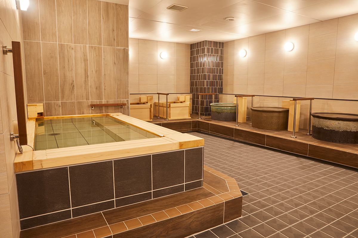 浴室内には3タイプの浴槽と3種類のお湯をお客さまに楽しんでいただきたいということで、各浴槽ごとにろ過装置の対応を行いました。別工事のサウナ側への出入りができるような対応も行っています。施設、建築会社、デザイナーの皆様に満足のいただく浴室となりました。