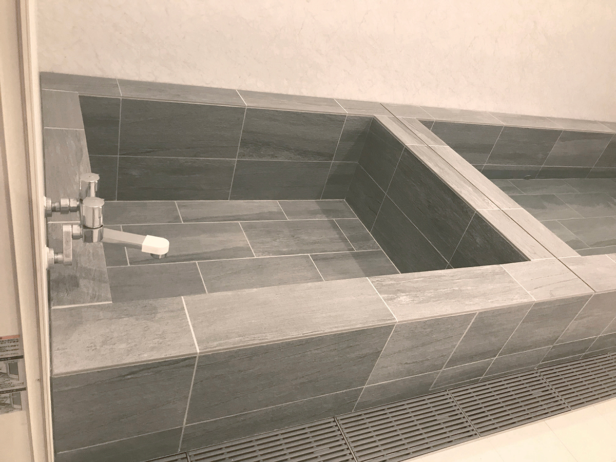 社員寮の改修工事で地下に浴室を設置しました。工期と建物への荷重を考慮しユニットバス化となりました。水風呂に入りたいとのご要望にお応えして大型浴槽の隣に小さな浴槽を設置しております。