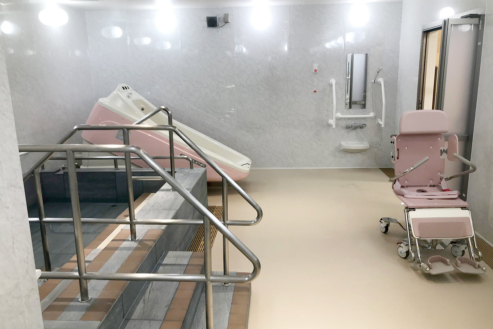 高齢のご利用者様にも優しいユニバーサル仕様です。浴槽内のステップや段差もタイルの色を貼り分けるなど配慮しました。