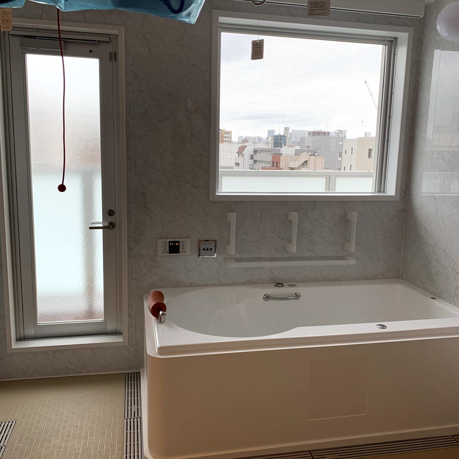 旦那様が体が不自由なため、天井走行リフトを設置した広い浴室とシャワードバス、奥様はジェット&ブローの浴槽と洗面器スペースを浴室脇に設置したいということで入口ドアを2か所設け、浴室内に洗濯物が干せるようにホスクリーンを設置しました。