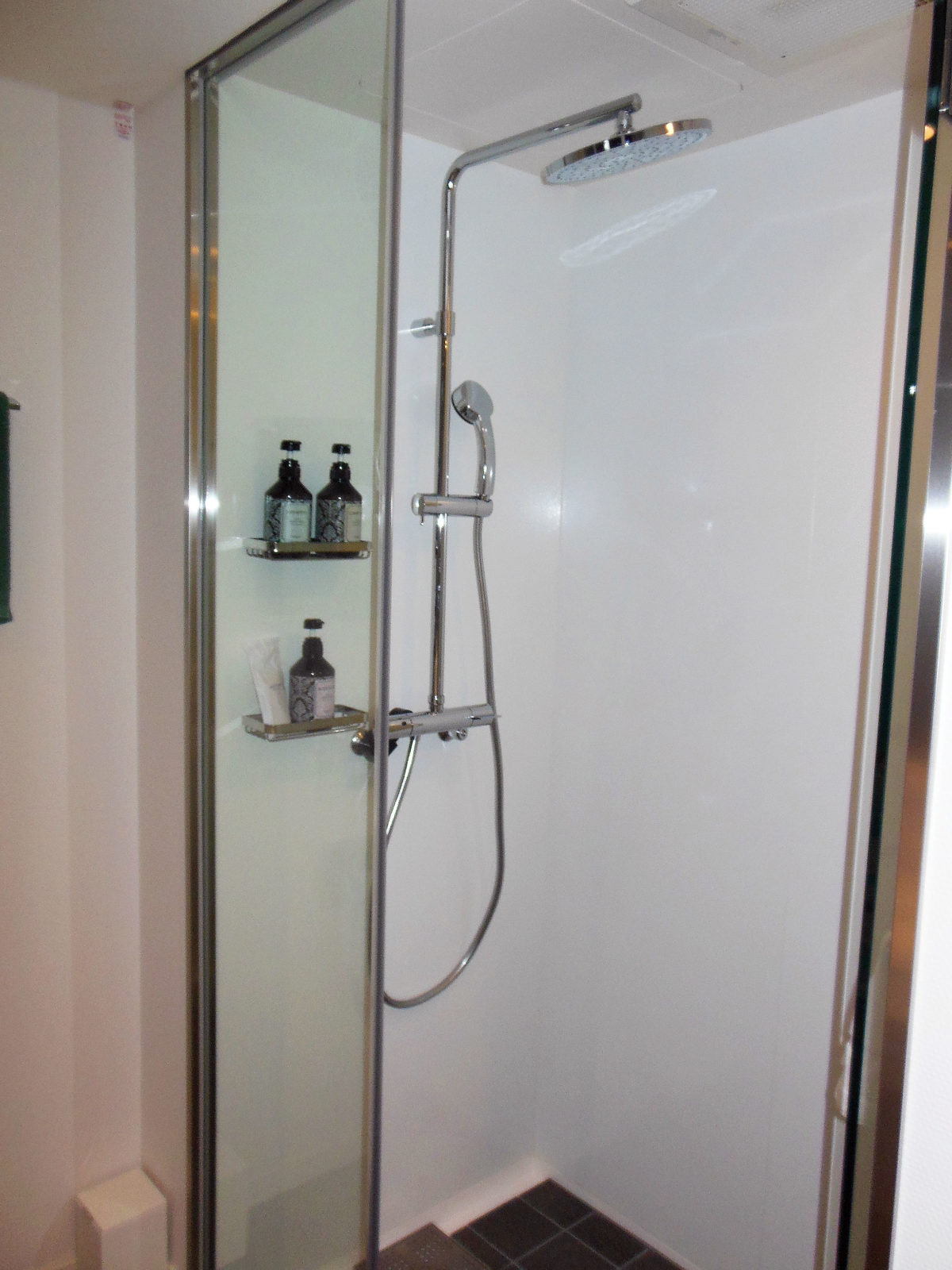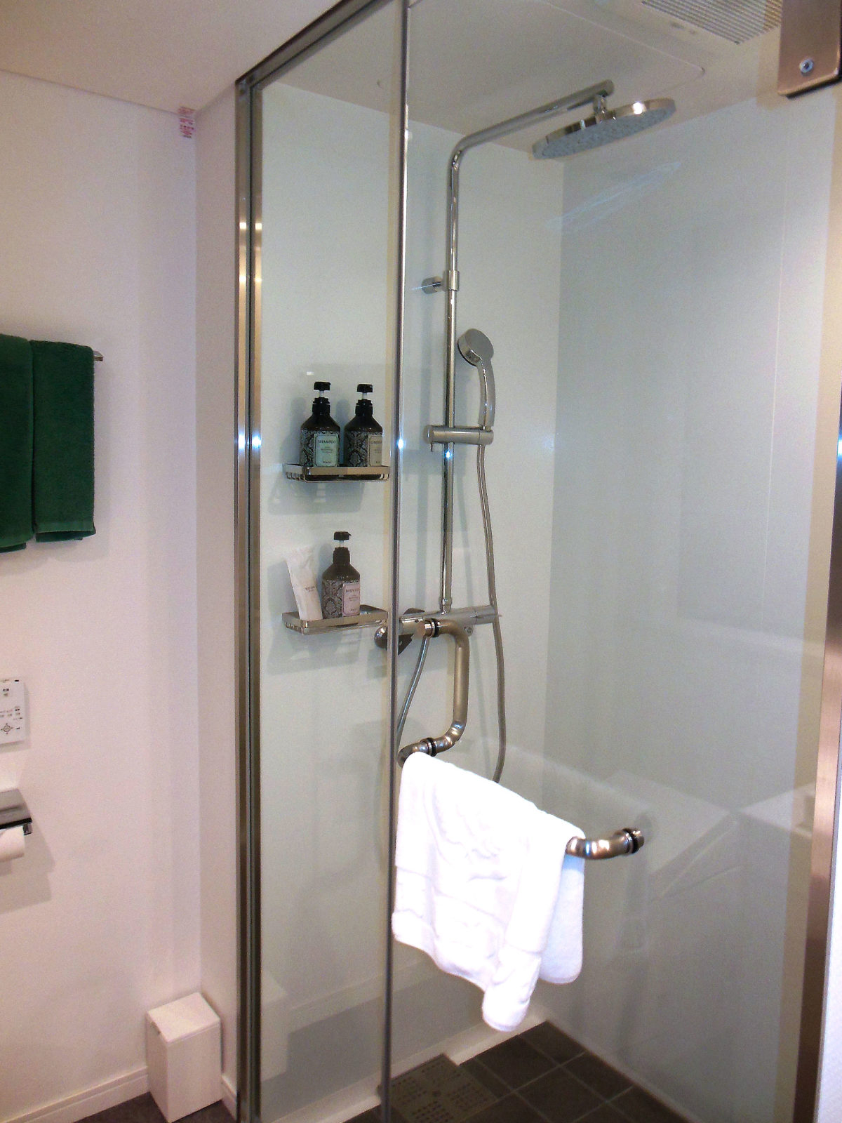 Details基本情報 サイズ 800㎜×1200㎜×高さ2130㎜ 主な仕様 天井:化粧鋼板パネル 壁:化粧鋼板パネル 床:145.5角タイル ドア:テンパードア(ステンレス枠) FIX:ステンレス枠 水栓:オーバーヘッドシャワーシステム