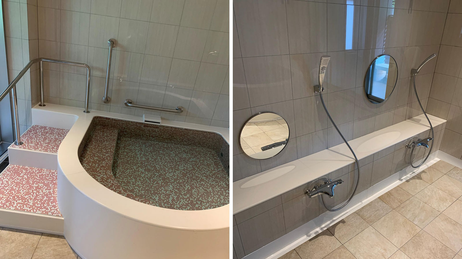 Outline概要 家族風呂として老若男女どなたにも使用しやすい浴室をご希望されました。 曲線的な浴槽形状と手摺とステップを多用した浴室デザインにこだわりました。 小笠原ならお客様のご要望やイメージをカタチにできます。浴槽や壁、床、バス空間内の細かいパーツまで、しっかりお打ち合わせをさせていただきカスタマイズします。数多くの企画施工を行ってきたからこそデザイン性にも自信があります。まずはご相談ください。