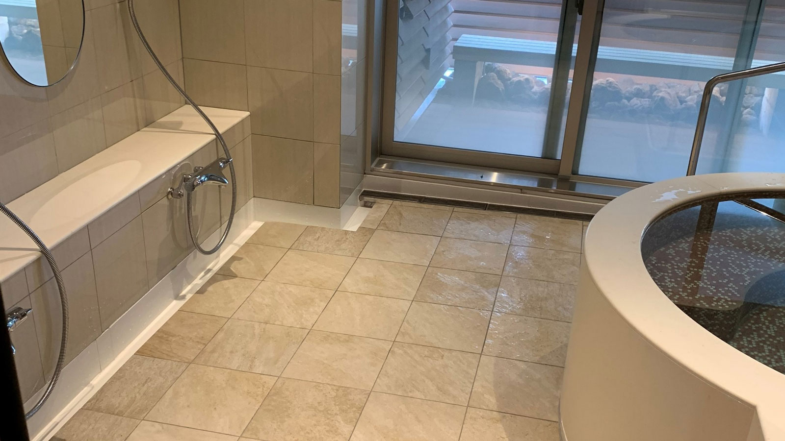 Details基本情報 サイズ 3530㎜×3140㎜×高さ2400㎜ 主な仕様 天井:化粧鋼板パネル 壁:298角タイル 床:298角タイル ドア:ガラス引き戸(ステンレス枠) FIX:ステンレス枠 浴槽:タイル貼り浴槽 水栓:サーモスタット付きシャワー水栓/埋込混合水栓