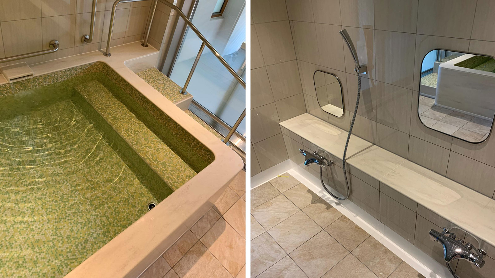 Outline概要 家族風呂として老若男女どなたにも使用しやすい浴室をご希望されました。 曲線的な浴槽形状と手摺とステップを多用した浴室デザインにこだわりました。 小笠原ならお客様のご要望やイメージをカタチにできます。浴槽や壁、床、バス空間内の細かいパーツまで、しっかりお打ち合わせをさせていただきカスタマイズします。数多くの企画施工を行ってきたからこそデザイン性にも自信があります。まずはご相談ください。