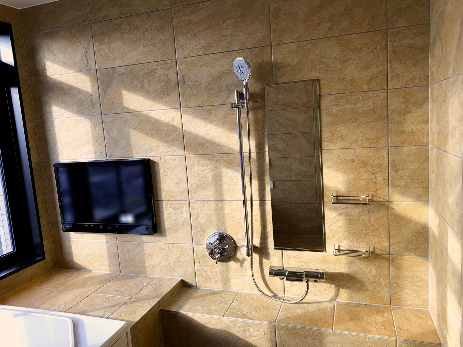 お風呂に浸かりながらテレビが見たいとご要望頂きましたので、大型の浴室用テレビをご提案しました。