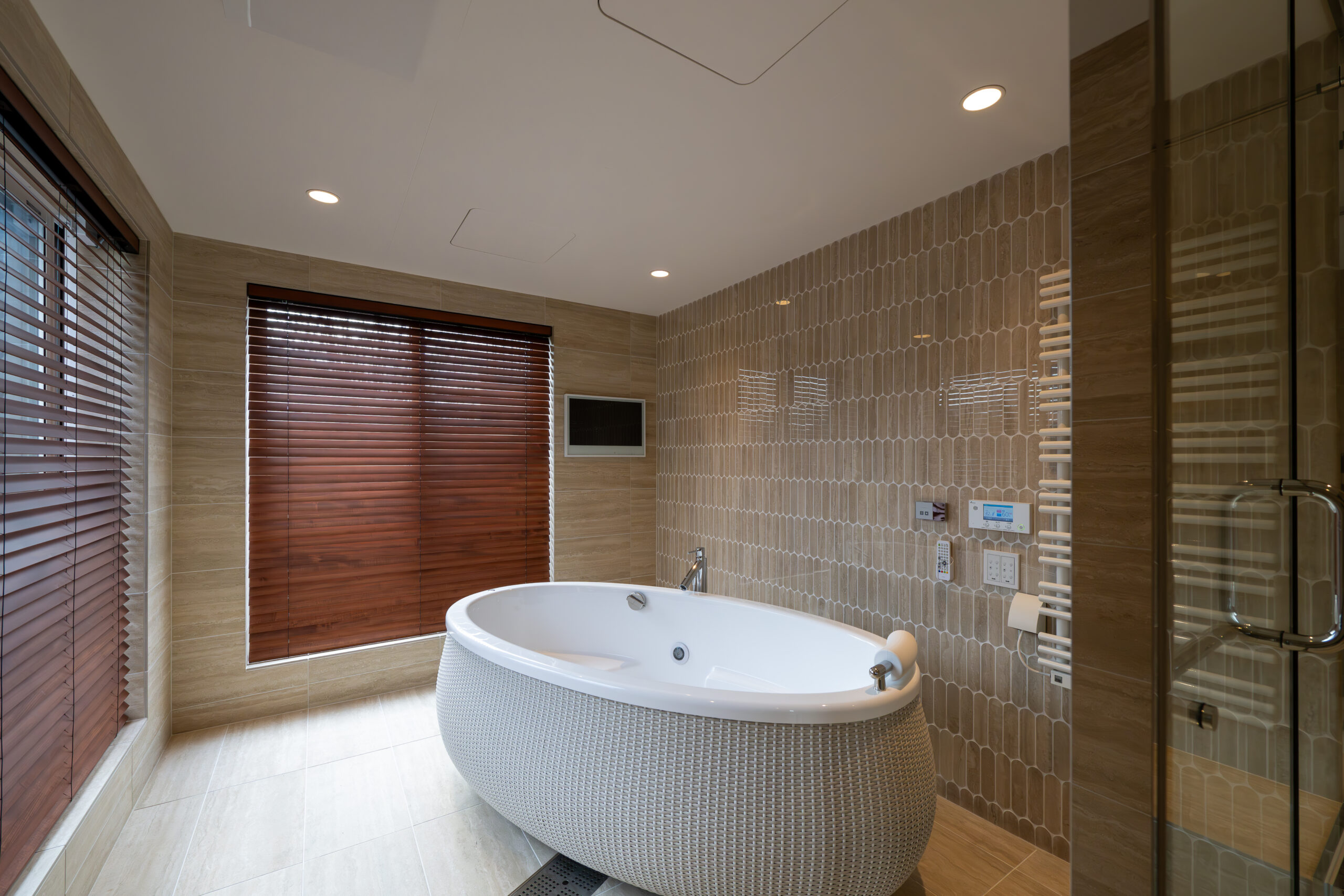 編み込み模様が美しいバスタブに、やわらかな色合いの壁と床が調和し、心地よい空間を演出します。